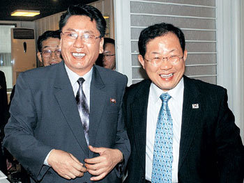 南北经济合作推进委员会南韩代表、财政经济部次官朴炳元(右)和北韩代表、内阁建设建材工业省副相崔永建11日在首尔中区五壮洞一家冷面馆共进午餐后,欢笑着走出饭店。