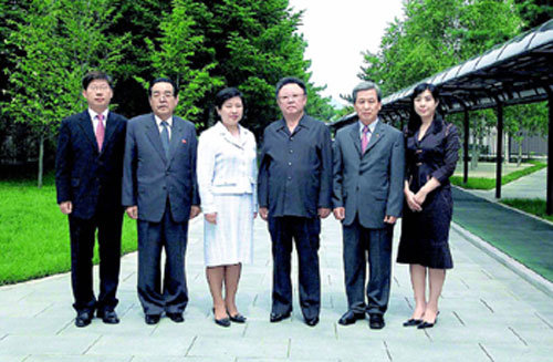 现代集团总裁玄贞恩(左3)和北韩国防委员长金正日(左4)于16日在江原院山举行会晤之前正在合影留念。一同参加会晤的还有现代峨山副总裁金润圭(右2)和现代集团总裁的长女、现代商船公司科长郑智丽(音译,右)。