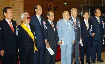 17日,在国会议事堂本馆中央厅举行的制宪节57周年纪念仪式上,国会议长金元基和前国会议长团拍摄了纪念照。左起依次是金元基议长、制宪同志会会长金仁湜、前国会议长李万燮、金守汉、前国会副议长闵宽植,隔一个人是前议员金玉仙、前国会议长朴宽用。
