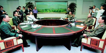 图为,为举行第3次将军级会谈,南北韩的实务代表于20日在板门店南方一侧的和平之家,正围坐在圆桌旁进行谈话。坐在圆桌左侧中央的是南方的首席代表文成默(国防部对北政策科科长)上校,坐在圆桌右侧中央的是北方的首席代表人民武力部大佐刘永哲。
