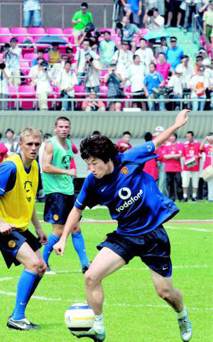 当天上午在北京工人体育场举行的曼联队训练中也表现出了弗格森教练上述宗旨。在37度的高温天气下,即使不作任何运动也会汗流浃背。在这种天气条件下选手们的比赛比预定时间延长的30分钟,高强度训练持续了90分钟之久。当天的队内联系赛中,朴智星与范尼斯特鲁伊、吉格斯、鲁尼等组成了一队,并与加里•内维尔、西尔韦斯特等主力防守选手展开了对决。