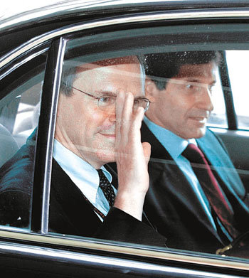 4日上午,参加6方会谈的美国代表团团长、美国国务院负责东亚太事务的助理国务卿克里斯托弗•希尔从北京的住处出发时,正在向记者挥手致意。希尔敦促北韩对是否同意共同文件草案表态,当天并没有和北韩方面进行双边接触。