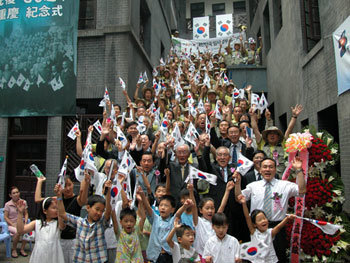 15日,在位于中国重庆的“大韩民国临时政府”大厦前举行了光复60周年纪念仪式。当时担任金九先生的警卫队长,在这里迎接光复的前光复会会长尹庆彬等爱国志士和光复会人士、大学生和当地侨民正在重现当日的感动和喜悦。