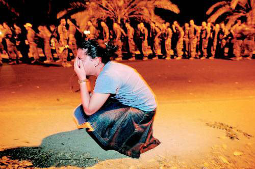终于抑制不住即将失去家园的痛苦而情绪失控。17日,以色列军队为强迫居民撤离,进入了加沙地区最大的定居点尼夫•德卡里姆。图为,一名少女蹲坐在地上放声大哭。