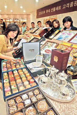 乐天百货商店21日在首尔松坡区蚕室店举行了推出中秋礼包,听取顾客意见的活动。百货商店方面正在展开如果预约订购就给与价格优惠,如果同样的种类买得多就再免费赠送1个等促销活动。