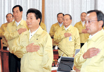为应付国家紧急事态的例行演习——“2005乙支焦镜”演习于22日开始。图为,卢武铉总统和政府官员于当天上午在青瓦台举行乙支焦镜国务会议前,正在举行国民仪式。