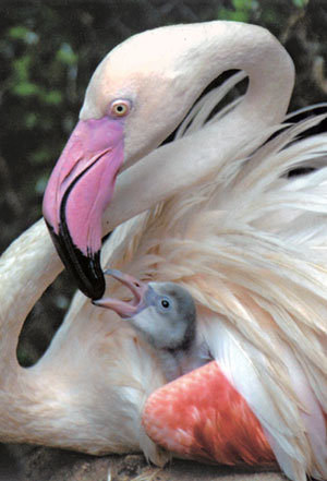 图为,在京畿龙仁市爱宝乐园孵化出来的欧洲红鹤幼仔25日与母亲对嘴的景象。红鹤幼仔在国内动物园诞生是25年来的首次。爱宝乐园决定从10月开始向游客公开13∼21日孵化出来的5只红鹤幼仔。