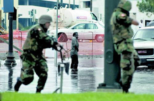 图为,1日,在美国路易斯安那州新奥尔良市内,州防卫军的士兵们正瞄准一名疑似武装歹徒的男子。自遭到飓风“卡特里娜”的袭击后,新奥尔良因掠夺和枪战,陷入了无政府状态。美国政府为恢复秩序,紧急派遣了州防卫军和当地警察。