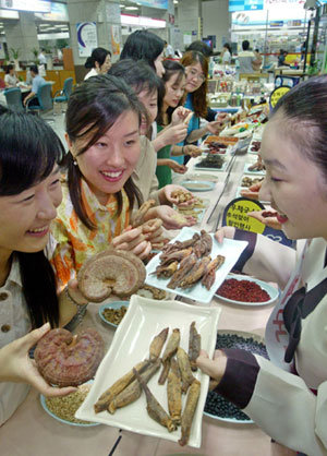 “哪一个才是国产红参?”5日,在首尔钟路区世宗路光化门邮局举行的迎中秋“猜国产农产品”活动中,参加活动的人们正在区分国产红参。图中前面碟子中的是国产红参。