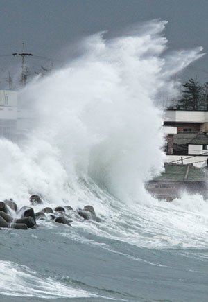 5日,济州岛进入了超大型台风“彩蝶”的间接影响范围。图为,北济州郡旧左邑月井里(音)海堤上正在激起的巨浪。当天上午12时开始,中央灾难安全对策本部对釜山、蔚山、全南、庆南北、济州地区发出台风灾难危机“注意(黄色)”警报,并嘱咐居民彻底防备。预计这些地区将会出现100毫米以上的大雨,还会刮强风。