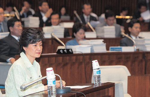 5日,朴槿惠代表(左)出席了在首尔汝矣岛国会举行的大国家党议员全体会议。朴槿惠在会议上斩钉截铁地称:“如果卢武铉总统在7日会谈中提议联政,就回答说不妥当。”