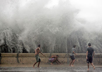 飓风中心预报说,向美国本土移动的热带飓风“丽塔”经过墨西哥湾,有可能转变为与“卡特丽娜”同级的“4级”飓风,并于周末左右袭击德克萨斯州。而且也有可能改变方向,再次横扫还没有从“卡特丽娜”造成的伤害中复原的路易斯安那州。图为,20日,“丽塔”袭击古巴哈瓦那堤防的情景。