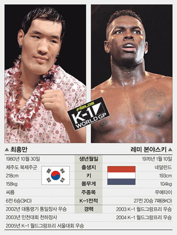 身高达218厘米崔洪万(24岁)将在11月19日在日本东京圆顶屋参加2005 K-1世界大奖赛总决赛8强赛,面对第1场比赛就将碰面的“K-1皇帝”雷默•邦加斯基(Remy Bonjasky,29岁,荷兰),毅然抛出了充满自信的挑战书。