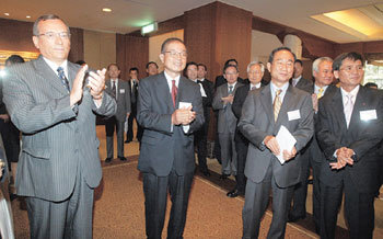 13日,俄罗斯驻韩新任大使伊巴森乔夫(前排左)欢迎午宴在首尔中区小公洞乐天酒店举行。韩-俄亲善协会会长柳宗夏(前外务部长官,前排中)和CEO咨询集团总裁姜锡珍等100多人出席了当天的午宴。