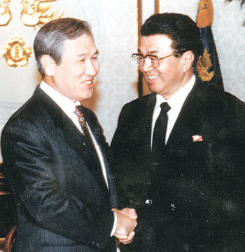 1990年9月6日,作为第一届南北高层会谈的北韩代表抵达首尔的前北韩总理延亨默(右)在青瓦台与当时的韩国总统卢泰遇进行会晤。当时,延亨默代表北方签署了南北基本协议书。