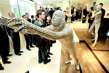 25日,在服装品牌Daks在首尔中区明洞开张的“Daks广场(plaza)”商场,顾客们正在观看瑞典造型艺术家拉斯•尼尔森(音)设计的Daks造型物“游戏已经结束了(Game is over)”。本商场销售英国总部的绅士服装和女性服装及国内所有的Daks品牌产品。