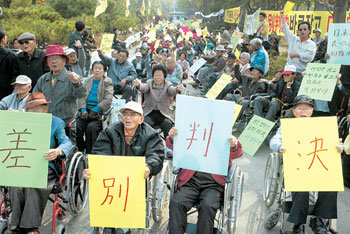 居住在全南高兴郡道阳邑小鹿岛和全国89个定居村的500多名麻风病人于28日在首尔钟路区薰井洞宗庙公园举行集会,抗议日本法院做出的判决,敦促日本政府进行补偿。逐字拼凑出的“差别判决”的牌子非常醒目。日本东京地方法院25日对韩国麻风病人提请的诉讼,下达了原告败诉的判决,但是同一天对台湾麻风病人却下达了胜诉的判决。