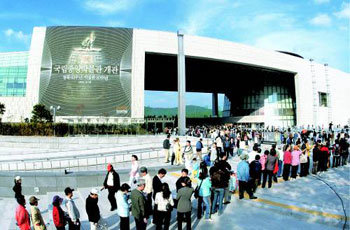 在首尔龙山的新国立中央博物馆开馆的28日下午,等待进入展室的参观者排起了长队。仅当天下午,就有2万多名参观者前来,显示出国民对博物馆的极大关心和期待。后面看到的是把传统城郭的形象用现代方式表现出来的博物馆本馆。该馆长404米,高43米,总面积达1.4万多坪,其中展示面积为8100多坪,是世界第六大博物馆。