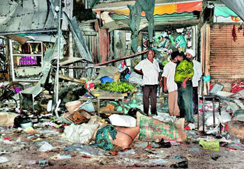 在距被称作印度教“光的庆典”的万灯节庆典还有三天之际,29日印度新德里发生了3起连环爆炸案,导致超过61人死亡。此次事件被推定为是反对印度和巴基斯坦和解气氛的印度内部伊斯兰籍反抗势力发动的恐怖袭击。图为,在首次发生爆炸案的新德里市中心的帕哈拉甘集市中,商人们正在环视布满鲜血的现场。