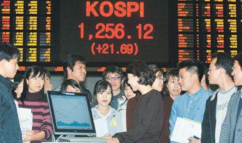 11日,受美国证券市场反弹和油价下降影响,KOSPI指数以历史最高点1256.12点收盘。图为,当天下午到首尔汝矣岛证券期货交易所见习的釜山大学学生们正在听取交易所负责人的说明。