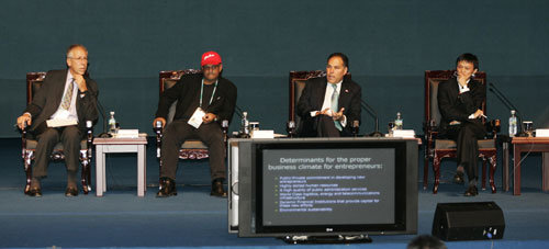 图为,17日上午在釜山乐天酒店举行的“APEC CEO峰会”讨论会上,讨论者们正在就企业家精神问题进行交谈。左起为,美国《财富》杂志国际版编辑罗伯特•福瑞德曼(Robert•Friedman)、亚洲航空首席执行官托尼.费尔南德斯(Tony• Fernandes)、巴拿马副总统兼外长萨穆埃尔•路易斯•纳瓦罗、阿里巴巴总裁马云。