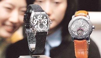 3日,现代百货商店首尔狎鸥亭店举行名牌手表展览会,展出了价值2.2亿韩元的手工手表Meteorite(右)。瑞士著名手表工匠安东尼•裴修素(Antoine Preziuso)用掉落在瑞典的陨石加工制作了该手表,而且仅制作了一块。