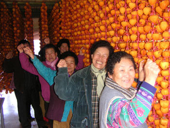 克服电脑盲障碍,通过电子商业交易实现富农梦想的全南光阳市津上面白鹤洞村的居民们,在打理过年期间出货的柿子饼前,正在高喊加油。