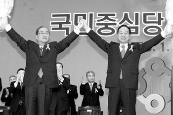 17日,在首尔松坡区芳夷洞奥林匹克公园击剑竞技场举行的国民中心党中央党创党大会上,被评选为共同代表最高委员的忠南知事沈大平(左)和议员辛国焕携手共同举起,回应议员和党员们的欢呼。