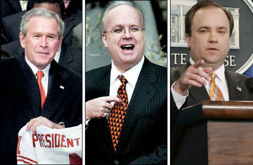 如果不想被制造走火事故的美国副总统切尼的手枪命中,就要穿显眼的橙色衣服?14日,美国大学美式足球冠军球队德克萨斯龙魂(音)队访问了白宫。图为,布什总统(左边照片)、白宫发言人麦克莱伦(中间照片)、秘书室副国务卿卡尔•罗伯戴着象征该大学的橙色领带出席。麦克莱伦开玩笑说:“我们戴橙色领带不是因为害怕走火,而是为了欢迎龙魂队。”难道这是为扭转情况有目的的玩笑?