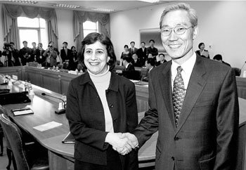 6日,在首尔钟路区世宗路外交通商部大楼举行了关于韩美自由贸易协定(FTA)协商的两国间第1次预备协商。韩国方面的首席代表金宗埙(右)和美国贸易代表部(USTR)代表助理温迪•卡特勒对预备协商及正式协商的日程、场所和协商领域等进行了讨论。