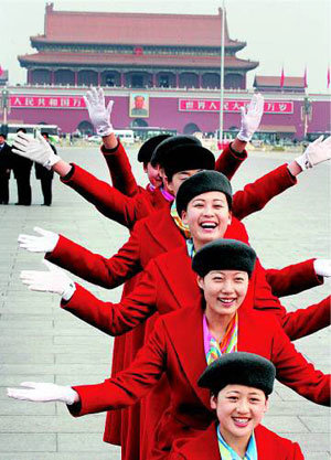 9日,相当于议会的全国人民代表大会(全国人大)接待员们在北京天安门广场上模仿千手观音摄影留念。在今年的全国人大上,出现了很多表情开朗的女接待员,吸引了各国记者的目光。