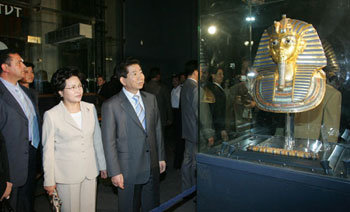 8日下午(当地时间),在埃及访问的韩国总统卢武铉夫妇正在参观位于开罗的国立中央博物馆的图坦卡蒙展示馆。