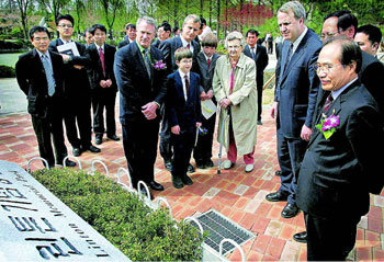 17日,林顿纪念公园开放仪式在位于大田大德区梧井洞的韩南大学举行。仪式结束后,林顿的子孙们来到在公园一侧建立的该校创立者、前辈威廉·林顿纪念碑前。带着胸花,两只手握在一起的是比尔·林顿。