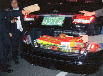 首尔警察厅调查2系调查官正在确认在民主党事务总长赵在焕的轿车后备箱中发现的4亿韩元。调查官没收了20日夜里在赵在焕车尾箱中发现的装有现金的苹果箱子。