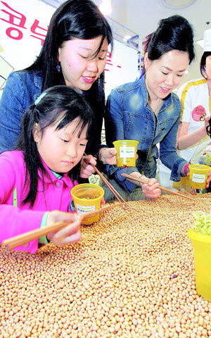 23日上午,“Pulmuone挑选好黄豆”大赛在首尔乐天超市永登浦店举行。参赛者正在用筷子夹黄豆,把它们放到能够培育黄豆芽的容器中。