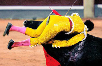 在纪念西班牙马德里市守护神的“圣伊西多尔庆祝日”(San Isidro,15日)即将来临之际,11日在拉斯班塔斯斗牛竞技场上举行的比赛上,出现了斗牛士差点被牛顶到的场面。比匕首还尖锐的牛角,非常惊险地擦过了斗牛士的双腿间。