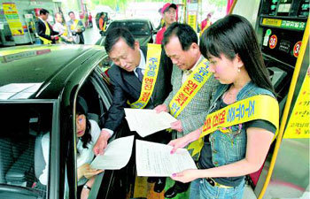 对持续的高油价,加油业界也开始展开活动。17日下午,在首尔永登浦区汝矣洞的一个加油站,韩国加油站协会会员正在向轿车司机展开“加油时熄灭引擎”活动。