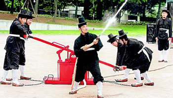 조선시대 소방훈련이 110년 만에 재현됐다. 19일 오후 서울 서초구 서초동 서울소방학교에서 1890년대 궁정 소방대의 복장을 갖춘 소방관들이 펌프를 사용해 불을 끄는 모습.