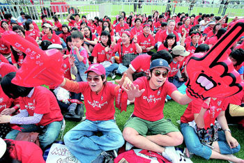 举行劲爆街头助威热身赛如何?祈愿韩国足球队在2006年德国世界杯上凯旋的街头助威正式开始。23日,面临在首尔世界杯竞技场举行的韩国队与塞内加尔队的热身赛,从几个小时前开始就早早聚集在首尔市厅前首尔广场的市民们正以开心的表情进行助威练习。