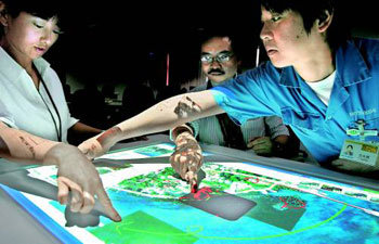 日本三菱电机开发出了能够让几个人同时用手触摸使用的“钻石触控屏”(音译)。2日,该公司的研究员们在触控屏(Touch Panel)上呈现出用卫星拍摄下来的印度尼西亚亚齐地区地震海啸前后的地图后,正在讨论躲避计划。公司方面解释说,如果利用这个触控屏,几个人可以一起看着显示器进行操作,方便共同作业。