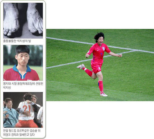 尽管韩国队在上半场第9分钟先失一球,处于被动,但最终以朴智星的进球,摆脱了危机。在13日进行的多哥战中先失球而处于被动时,为实现大逆转而创造机会的也是朴智星。作为2002年韩日世界杯四强神话的主角,朴智星在世界杯后,跟随希丁克加入了荷兰的埃因霍温队。开始时并不容易。右膝盖受伤,上了手术台,陷入低谷。球迷和队友们都以冷眼对他。就是否放弃梦想中的欧洲舞台,朴智星陷入了苦恼,但最终还是重新活跃在荷兰的恶劣环境中,并于去年6月转会到最高舞台——英格兰超级联赛的曼联俱乐部。
