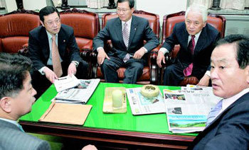 30日,在国会举行的紧急党政协商会上,开放的我们党政策委员会议长康奉均(右)和院内代表金汉吉(右二)、行政自治部长官李庸燮(右四)等人正在就缓和财产税负担问题展开讨论。