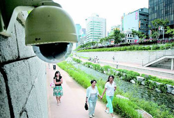 6日下午,来到首尔清溪川散步的市民们正经过设在三一桥附近的闭路电视(CCTV)下方。国家人权委向首尔市设施管理公团建议,就CCTV拍摄与否和设置场所、运营时间发布通知。