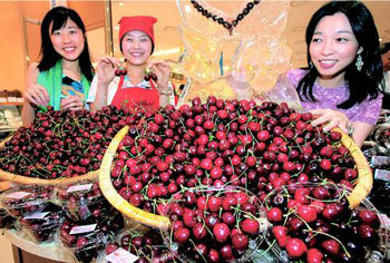 9日,首尔中区忠武路新世界百货商店总店推出了产自美国华盛顿、俄勒冈州、爱达荷州、尤他州的“冰樱桃(华盛顿樱桃)”。该樱桃比一般樱桃坚硬,口感相对较脆。售价为500克9800韩元。