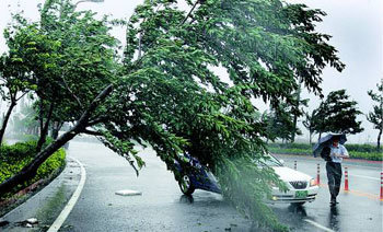 由于台风“艾云尼”北上到达内陆地区,全国遭到强风和暴雨的袭击。10日上午,庆南镇海市海岸公路边的行道树被强烈的风雨连根拔起,险些压到汽车。