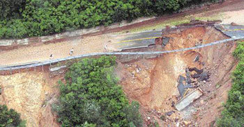 从江原襄阳郡五色药水向寒溪岭休息所方向的44号国道仿佛遭到炮击一般,因暴雨引发的泥石流导致公路塌陷。17日,护栏在塌陷的道路上像云梯一般悬空,居民正从道路之间走下来。