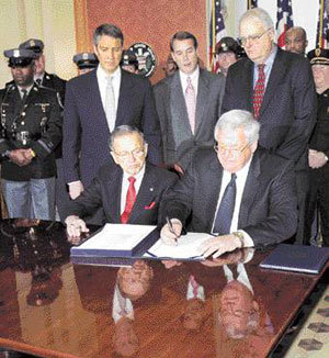 5月8日,在议会上,美国众议院议长丹尼斯·哈斯特尔特(前排右)正在爱国法修改案上签字。美国根据该修改案,来制约与违反《谢尔曼法》(《反托拉斯法》)的恐怖组织进行通商和交易的行为。