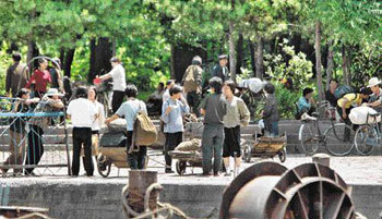 中国丹东市和北韩新义州隔着鸭绿江相对。天气明媚的23日(周日)下午,从丹东望去,大批北韩人站在对岸。背着口袋或放在手推车上的他们似乎在等人。从他们身上隐约可以看到一丝艰辛。