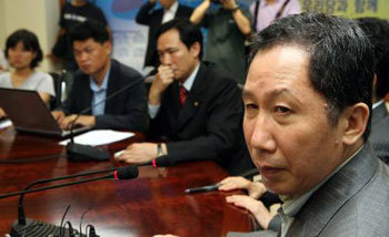30日,開放的我們党議長金槿泰(右)在首爾永登浦黨部舉行了記者座談會。記者陸續對教育副總理金秉准的去留問題發問後,金槿泰說:“需要進一步確認事實關係。”