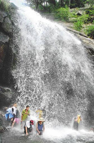 全国都笼罩在30多度高温下的31日,避暑客纷纷聚集到位于智异山山脚下的全罗南道求礼郡山东面水落瀑布,他们淋着从20多米高处落下的瀑布水消除酷暑。